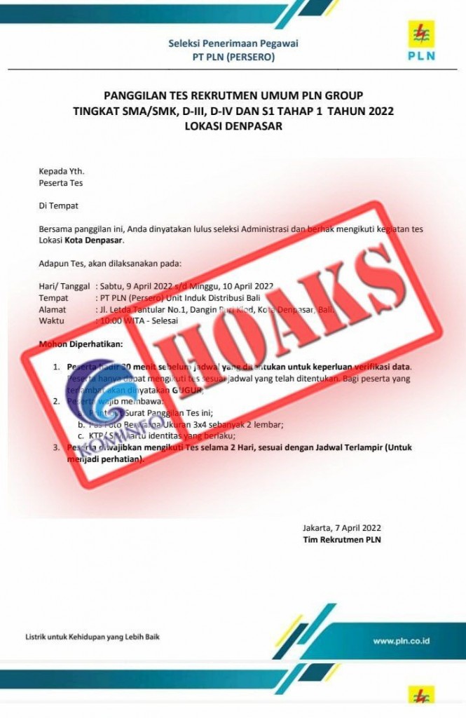 Faktanya, dilansir dari baliportalnews.com, Manajer Komunikasi PT PLN (Persero) Unit Induk Distribusi Bali, I Made Arya menjelaskan, surat panggilan untuk mengikuti tes calon pegawai PLN adalah surat palsu. Menurut I Made Arya, PLN Group memang melakukan rekrutmen calon pegawai PLN dengan periode pendaftaran 28 Maret – 01 April 2022 namun semua prosesnya dilakukan satu pintu melalui situs resmi rekrutmen.pln.co.id serta tanpa dipungut biaya apapun.