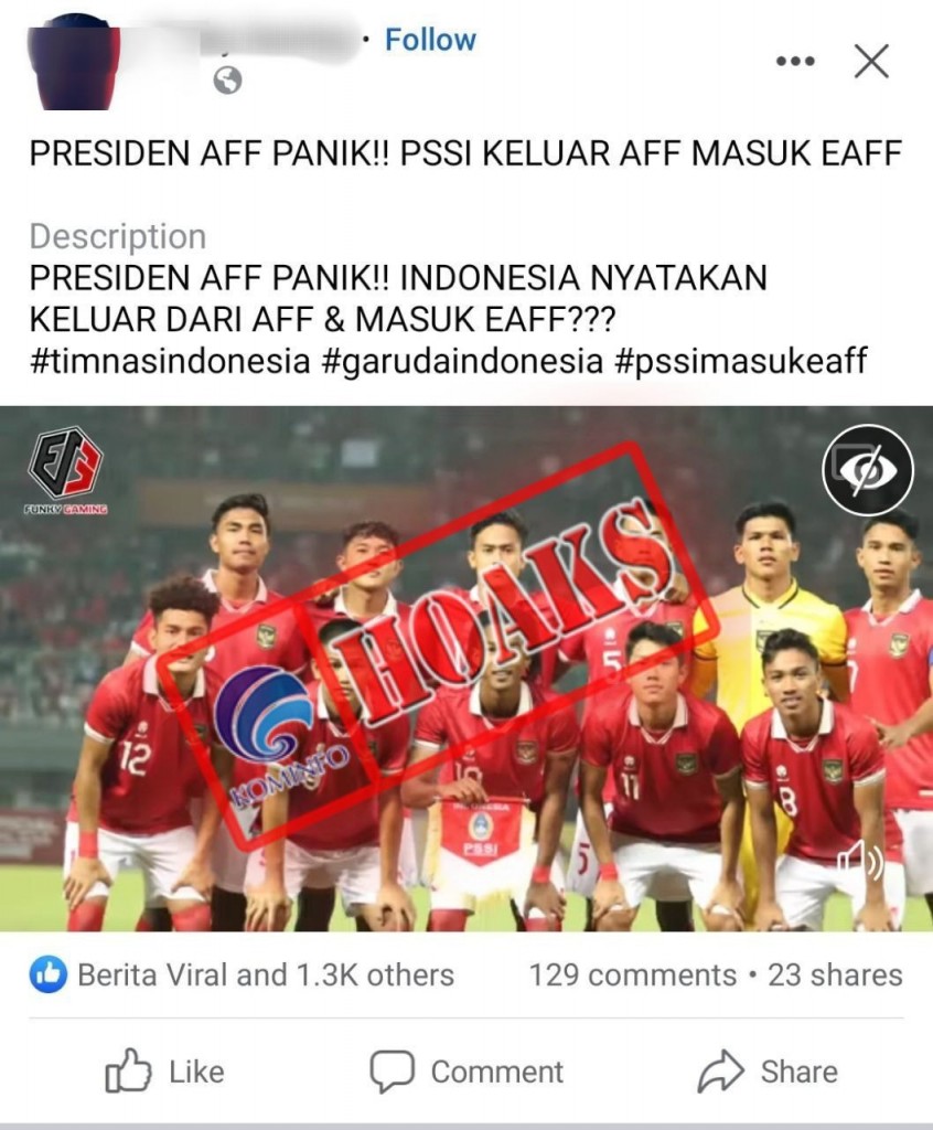 Beredar di media sosial Facebook, sebuah unggahan video yang mengklaim bahwa ASEAN Football Federation (AFF) terancam akan rugi besar jika Persatuan Sepak Bola Seluruh Indonesia (PSSI) dan Timnas Indonesia angkat kaki dan pindah ke East Asian Football Federation (EAFF). Unggahan video tersebut telah disukai oleh 1.300 pengguna Facebook.