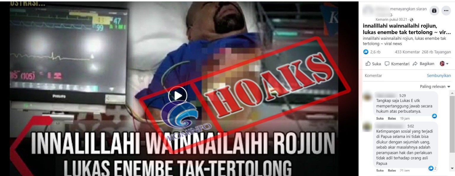 Faktanya, dilansir dari kompas.com, informasi bahwa Gubernur Papua Lukas Enembe meninggal dunia adalah tidak benar. Isi video yang diunggah tersebut juga berbeda dengan narasi yang diberikan. Dikutip dari kumparan.com, dokter pribadi Gubernur Papua Lukas Enembe, Anthon Mote membantah kabar beredar yang menyebutkan Lukas Enembe meninggal dunia. Ia menjelaskan bahwa Lukas Enembe saat ini masih sakit dan masih dilakukan observasi ketat dengan melakukan koordinasi dengan dokter di Singapura.