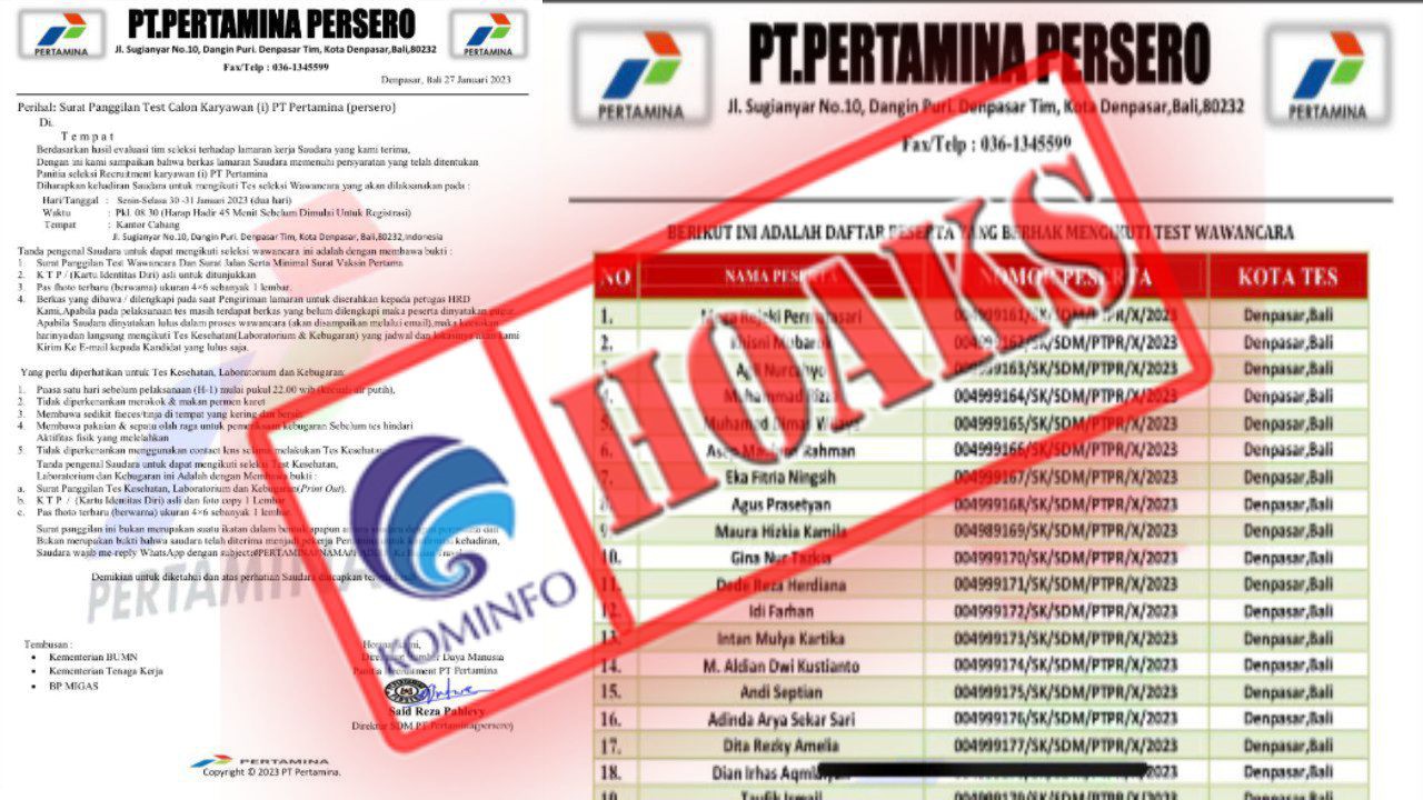 Beredar undangan panggilan tes kerja calon karyawan mengatasnamakan PT Pertamina. Dalam surat tersebut tertulis pelaksanaan tes selanjutnya dilaksanakan pada 30-31 Januari 2023 di Jalan Sugianyar Nomor 10, Dangin Puri, Denpasar Timur, Kota Denpasar, Bali. Terdapat pula lampiran yang berisi daftar semua nama peserta yang mengikuti tes tersebut.