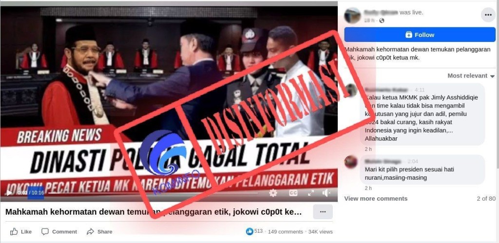 Beredar sebuah unggahan video di platform YouTube yang mengeklaim bahwa Presiden Joko Widodo (Jokowi) memecat Ketua Mahkamah Konstitusi (MK) Anwar Usman karena pelanggaran etik. Unggahan tersebut bertuliskan “Mahkamah kehormatan dewan temukan pelanggaran etik, jokowi c0p0t ketua mk”.