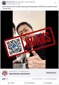 Beredar di media sosial Facebook sebuah unggahan pada akun yang mengatasnamakan pengusaha King Kevin yang membagikan video dengan narasi “saya King kevin 200 orang tercepat yang mengucapkan {HADIR} aku transfer 25 juta, secara acak”.