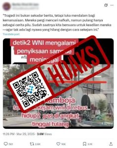 Beredar unggahan video di media sosial X/Twitter yang diklaim memperlihatkan penyiksaan Warga Negara Indonesia (WNI) di Kamboja.