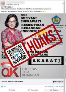 Beredar sebuah informasi di media sosial Facebook yang mengeklaim pencairan dana bansos Kementerian Keuangan dengan menampilkan gambar Menteri Keuangan Sri Mulyani serta logo Kementerian Keuangan dan Otoritas Jasa Keuangan (OJK).