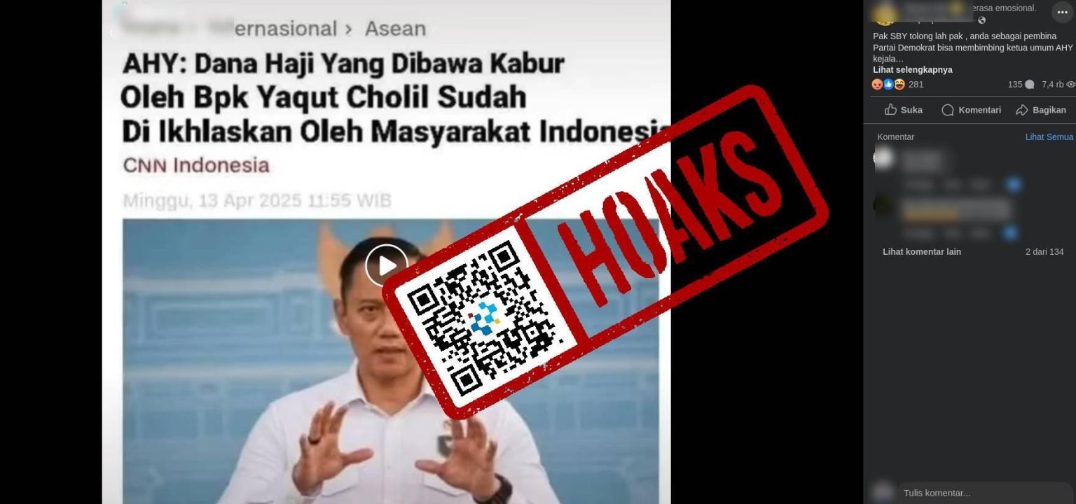 Beredar sebuah unggahan di media sosial Facebook yang mengeklaim bahwa Menteri Koordinator (Menko) Bidang infrastruktur dan Pembangunan Kewilayahan Agus Harimurti Yudhoyono (AHY) meminta masyarakat untuk mengikhlaskan dana haji yang dibawa kabur Mantan menteri Agama Yaqut Cholil Qoumas.