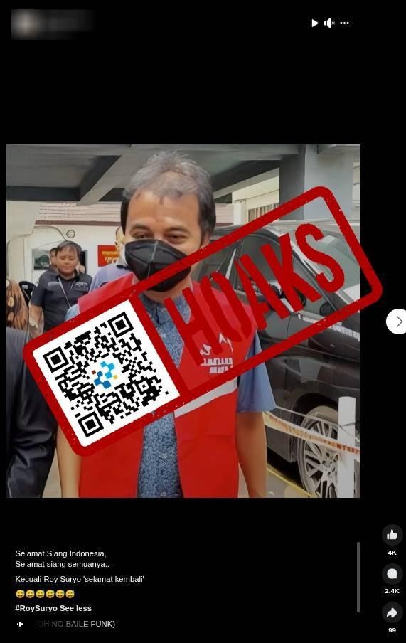 Beredar sebuah unggahan di media sosial Facebook dengan gambar mantan Menteri Pemuda dan Olahraga Roy Suryo yang mengenakan rompi tahanan berwarna merah dengan narasi yang seolah terjerat hukum terkait kasus tudingan ijazah palsu milik Joko Widodo (Jokowi).