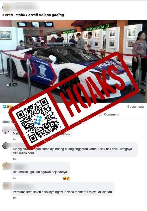 Beredar unggahan foto di media sosial Facebook yang mengkelaim mobil patroli milik Polisi Sektor (Polsek) Kelapa Gading menggunakan Lamborghini.