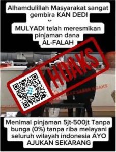 Faktanya, narasi dalam unggahan tersebut adalah tidak benar. Dilansir dari akun Instagram @jabarsaberhoaks, video yang diunggah merupakan potongan video yang berasal dari kanal YouTube DPRD JAWA BARAT terkait kegiatan rapat paripurna DPRD provinsi Jawa Barat pada 22 Mei 2025 yang dihadiri oleh Gubernur Jawa Barat Dedi Mulyadi. Pada rapat tersebut tidak ada penjelasan maupun pernyataan terkait pinjaman dana Al-Falah. Selain itu, pencarian di di akun Instagram resmi Dedi Mulyadi @dedimulyadi71, YouTube @KANGDEDIMULYADICHANNEL, akun TikTok dedimulyadiof?cial, tidak ditemukan konten atau informasi pernyataan Kang Dedi Mulyadi meresmikan pinjaman online dana Al-Falah.