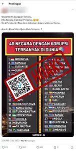 Beredar sebuah unggahan di media sosial Twitter yang mengeklaim Indonesia merupakan negara dengan korupsi paling banyak di dunia. Dalam narasi tersebut, ditampilkan seolah-olah Indonesia menempati peringkat pertama dalam daftar 40 negara dengan tingkat korupsi tertinggi di dunia.