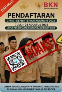 Beredar unggahan di media sosial tautan yang diklaim sebagai akses untuk pendaftaran Calon Pegawai Negeri Sipil (CPNS) 2025 mengatasnamakan Kementerian Agama Republik Indonesia (Kemenag RI).