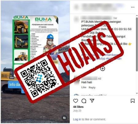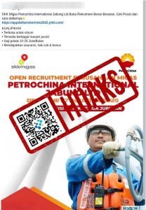 Faktanya, informasi tersebut adalah tidak benar. Dilansir dari saberhoaks.jabarprov.go.id, setelah dilakukan pengecekan tautan yang beredar, hasilnya tidak mengarah pada situs resmi milik Petrochina International Jabung Ltd, melainkan mengarah pada permintaan data pribadi berupa nama lengkap sesuai E-KTP dan nomor Telegram aktif. Lebih lanjut, pada situs resmi Petrochina International Jabung Ltd petrochina.co.id, tidak ditemukan informasi mengenai pembukaan lowongan pekerjaan seperti unggahan yang beredar. Segala bentuk informasi mengenai rekrutmen Petrochina International Jabung Ltd dapat diakses langsung melalui situs resmi atau media sosial Instagram @petrochina_id.
