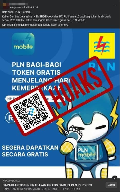 Beredar unggahan di media sosial Facebook berisi informasi terkait token listrik gratis jelang hari kemerdekaan dari PLN disertai narasi “Halo sobat PLN (Persero) Kabar Gembira Jelang Hari KEMERDEKAAN dari PT. PLN(persero) bagi-bagi token listrik gratis senilai Rp250.000,- Daftar dan segera klaim token gratis dari PLN Mobile Klik link di bio untuk mendaftar dan segera klaim tokennya. Unggahan tersebut juga disertai sebuah tautan pendaftaran.