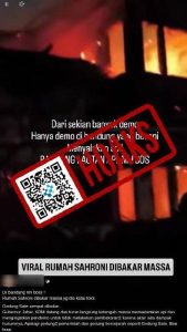 Faktanya, klaim dalam unggahan tersebut adalah tidak benar. Dilansir dari kompas.com, rumah yang berada di persimpangan Jalan Diponegoro dan Cilamaya, Kota Bandung, Provinsi Jawa Barat bukanlah rumah Sahroni. Rumah tersebut merupakan rumah aset milik Majelis Permusyawaratan Rakyat Republik Indonesia (MPR RI). Sebelum terbakar akibat lemparan bom molotov, rumah itu sempat dilempari batu dan benda lain. Namun, tidak ada korban jiwa dari aksi pengrusakan tersebut.