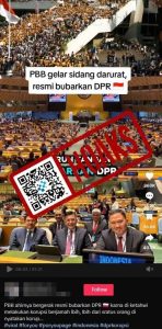 Beredar di media sosial TikTok sebuah unggahan yang menyebutkan bahwa PBB menggelar sidang darurat resmi bubarkan Dewan Perwakilan Rakyat Republik Indonesia. Unggahan tersebut disertai narasi pendukungnya “BB ahirnya bergerak resmi bubarkan DPR karna di ketahwi melakukan korupsi berjamah Ibih, Ibih dari sratus orang di nyatakan korup”.