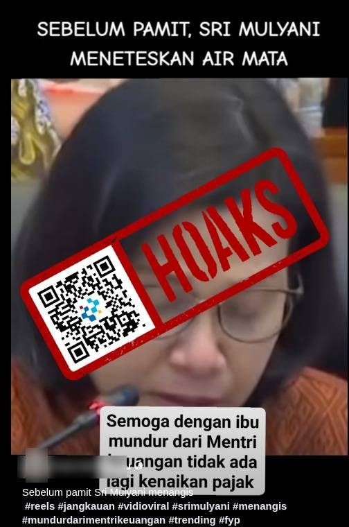 Faktanya, klaim tersebut adalah tidak benar. Dilansir dari kompas.com, momen Sri Mulyani menangis bukan dalam konteks purnatugas pada 2025. Sri Mulyani menangis saat menyampaikan salam dan pidato perpisahan kepada Banggar Dewan Perwakilan Rakyat Republik Indonesia dalam rapat kerja (raker) pada Selasa, 17 September 2024. Ia berterima kasih kepada rekannya di jajaran Kementerian Keuangan dan DPR RI yang telah bekerja sama sejak 2016. Video Sri Mulyani menyampaikan salam perpisahan dapat dilihat di kanal YouTube Kompas.com berjudul “[FULL] Sri Mulyani Menangis Saat Pamit ke DPR RI”.
