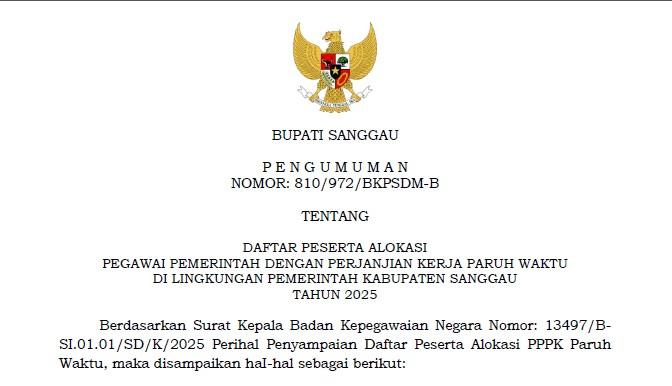 PENGUMUMAN BUPATI SANGGAU TENTANG DAFTAR PESERTA ALOKASI PEGAWAI PEMERINTAH DENGAN PERJANJIAN KERJA PARUH WAKTU DI LINGKUNGAN PEMERINTAH KABUPATEN SANGGAU TAHUN 2025