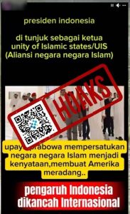 Beredar unggahan di media sosial Facebook berisi narasi yang mengeklaim Presiden Prabowo menjadi ketua Unity of Islamic States (Aliansi Negara-negara Islam). Dalam video tersebut menampilkan foto Presiden Prabowo bersama pemimpin negara Qatar atau Emir Qatar dan perdana menteri.