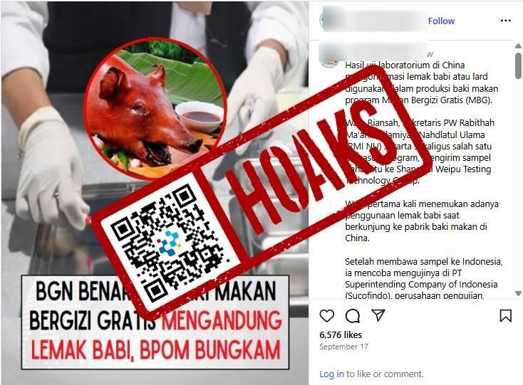 Beredar unggahan di media sosial Instagram yang menyebutkan Badan Gizi Nasional (BGN) mengakui ompreng Makan Bergizi Gratis (MBG) mengandung minyak babi.
