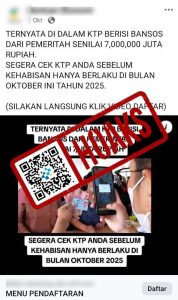 Beredar unggahan di media sosial Facebook berisi tautan yang diklaim untuk mengecek KTP yang menerima bantuan sosial pada Oktober 2025.
