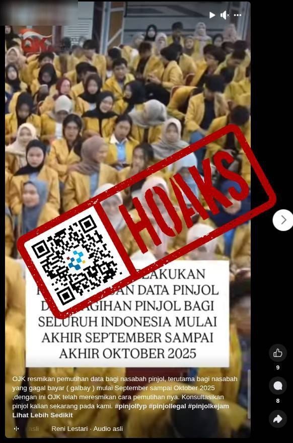 Faktanya, klaim dengan narasi OJK menghapus data nasabah pinjol yang gagal bayar adalah hoaks. Dilansir dari kompas.com, video yang dibagikan akun tersebut berasal dari unggahan akun Instagram resmi OJK @ojkindonesia pada 22 Agustus 2025. Video itu menampilkan Kepala Eksekutif Pengawas Inovasi Teknologi Sektor Keuangan, Aset Keuangan Digital, dan Aset Kripto OJK Hasan Fawzi menghadiri acara Indonesia Blockchain Conference (IBC) 2025. OJK telah membantah adanya penghapusan data nasabah pinjol gagal bayar atau pemutihan utang pinjol melalui akun Instagramnya @ojkindonesia pada 4 September 2025. Masyarakat diimbau untuk mewaspadai modus penipuan mengatasnamakan OJK. Apabila membutuhkan informasi resmi dapat menghubungi Kontak OJK 157.