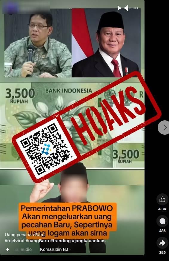 Beredar di media sosial Facebook sebuah unggahan video menampilkan banyak uang pecahan baru dari mulai dari Rp3.500, Rp22.500, Rp40.000, Rp50.000, Rp100.000,Rp175.000, dan Rp250.000 dengan narasi yang bernarasikan “Pemerintahan PRABOWO Akan mengeluarkan uang pecahan Baru, Sepertinya uang logam akan sirna”.