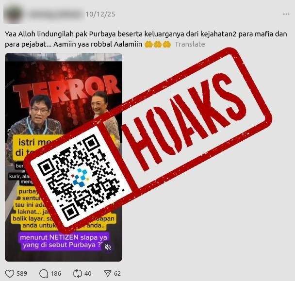 Beredar unggahan di media sosial Threads berisi narasi yang mengeklaim bahwa istri Menteri Keuangan (Menkeu) Purbaya diteror paket berisi darah segar tanpa pengirim. Selain itu terdapat kutipan dari Menkeu Purbaya yang menyatakan “Hadapi saya, jangan sentuh keluarga saya!”.