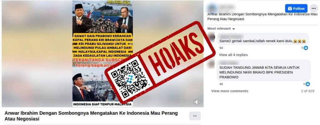 Beredar unggahan di media sosial Facebook narasi yang mengeklaim bahwa Presiden Prabowo kerahkan kapal perang KRI Brawijaya-320 dan KRI Prabu Siliwangi-321 untuk melindungi Ambalat dari Malaysia.