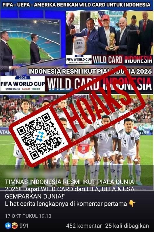 Beredar unggahan di media sosial Facebook berisi narasi yang mengeklaim bahwa Federasi Sepak Bola Internasional (FIFA) resmi mengumumkan bahwa Indonesia resmi masuk Piala Dunia 2026 melalui jalur wild card.