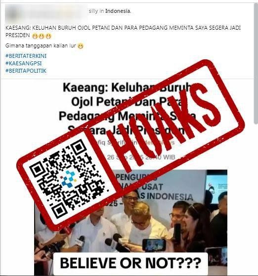 Faktanya, klaim tersebut adalah tidak benar atau hoaks. Dilansir dari jalahoaks.jakarta.go.id, setelah dilakukan penelusuran menggunakan Google Lens dengan memasukan tangkapan layar tersebut, hasilnya tidak ditemukan pernyataan terkait buruh dan ojol mendorong Kaesang menjadi presiden. Diketahui bahwa tangkapan layar merupakan hasil manipulasi. Adapun, artikel yang sebenarnya berjudul “Kaesang Ungkap Alasan Giring Ganesha Tak Masuk Kepengurusan Baru PSI” yang tayang di laman detik.com pada 26 September 2025. Artikel yang sebenarnya membahas mengenai mantan Ketua Umum PSI Giring Ganesha tidak masuk daftar susunan pengurus DPP PSI periode 2025-2030. Ketum PSI Kaesang Pangarep mengatakan hal itu merupakan keputusan pribadi yang diambil Giring.
