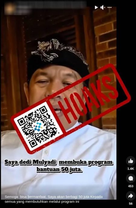 Faktanya, klaim Gubernur Jawa Barat Dedi Mulyadi diklaim memberikan dana bantuan kepada tenaga kerja Indonesia (TKI) melalui Facebook merupakan hoaks. Dilansir dari kompas.com, hasil penelusuran video itu merupakan hasil manipulasi dari unggahan akun TikTok @dedimulyadiof?cial milik Gubernur Jawa Barat Dedi Mulyadi. Dalam video aslinya, Dedi menyampaikan pesan edukasi kepada orang tua agar bisa menerima ketika anaknya mendapat hukuman dari guru di sekolah. Sementara itu, setelah dicek menggunakan Hive Moderation, suara Dedi menawarkan bantuan kepada TKI terdeteksi dihasilkan oleh arti?cial intelligence (AI).