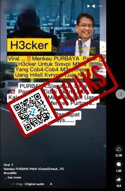 Beredar sebuah unggahan video di media sosial Facebook yang mengeklaim narasi bahwa Menteri Keuangan (Menkeu) Purbaya memakai hacker untuk susupi ma?a penyimpan uang hasil korupsi.