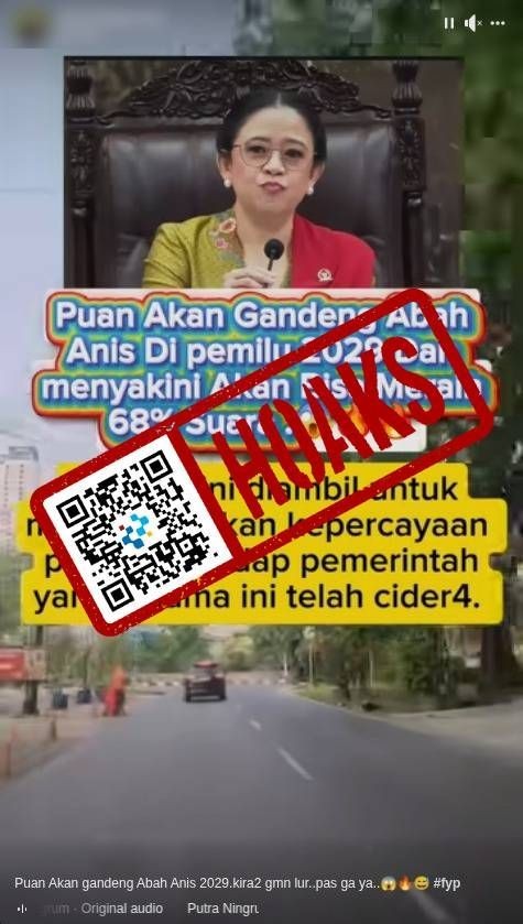 Beredar unggahan di media sosial Facebook berisi narasi yang mengeklaim bahwa Puan Maharani akan gandeng Anies Baswedan pada Pemilu 2029 dan meyakini akan meraih 68 persen suara.