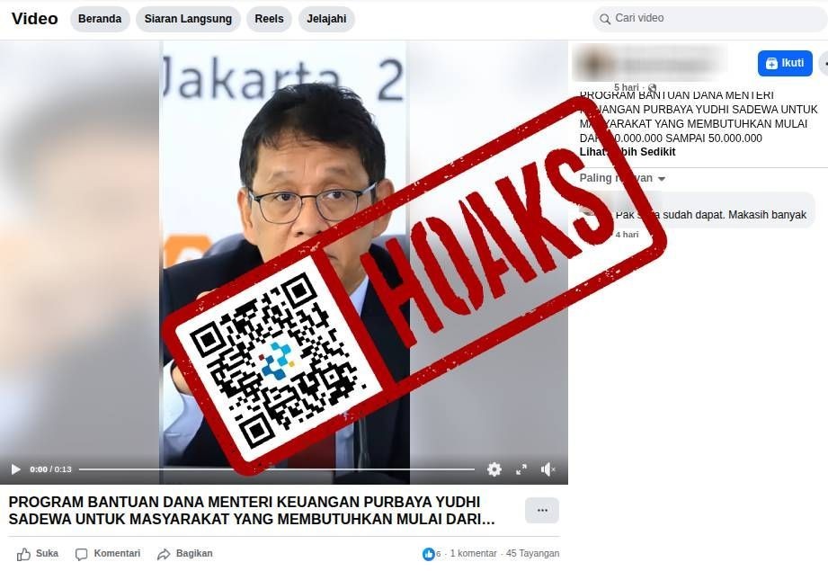 Beredar sebuah unggahan video di media sosial yang mengeklaim Menteri Keuangan Purbaya Yudhi Sadewa memberikan bantuan uang tunai senilai Rp10 juta hingga Rp50 juta kepada masyarakat.