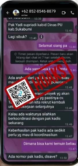 Faktanya, dilansir dari akun Instagram resmi Pemerintah Kabupaten Sukabumi @pemkab_sukabumi_diskominfo, nomor tersebut bukan milik Kabid SDA Dinas PU Kabupaten Sukabumi Yadi Supriyadi. Masyarakat diimbau untuk selalu mengon?rmasi kebenaran informasi yang diterima dan melaporkan pesan yang mencurigakan.