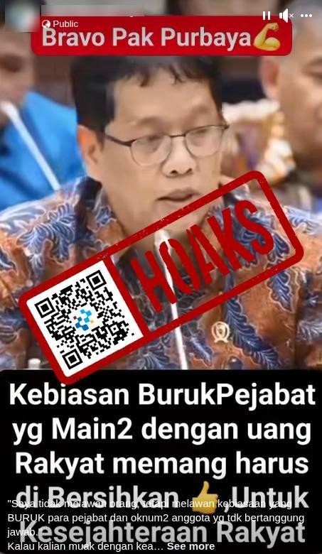 Beredar di media sosial sebuah unggahan video yang mengeklaim Menteri Keuangan Purbaya Yudhi Sadewa mengatakan bahwa ia masuk ke pemerintahan untuk melawan kebiasaan buruk pejabat yang menyelewengkan uang rakyat.