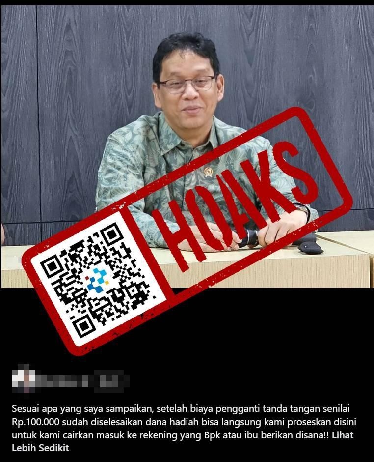 Beredar di media sosial Facebook unggahan yang memperlihatkan Menteri Keuangan (Menkeu) Purbaya dengan klaim narasi “Sesuai apa yang saya sampaikan, setelah biaya pengganti tanda tangan senilai Rp.100.000 sudah diselesaikan dana hadiah bisa langsung kami proseskan disini untuk kami cairkan masuk ke rekening yang Bpk atau ibu berikan disana!!”.