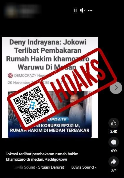 Faktanya, klaim tersebut adalah tidak benar. Dilansir dari kompas.com, setelah dilakukan pengecekan melalui mesin pencari Google dengan memasukan kata  kunci”Denny Indrayana Sebut Jokowi Terlibat Pembakaran Rumah Hakim PN Medan”, hasilnya mengarah ke artikel yang dipublikasikan democrazy.id berjudul “UPDATE! Pembakar Rumah Hakim PN Medan Khamzaro Waruwu Ditangkap, Ini Sosoknya” yang tayang pada 20 November 2025.Dalam artikel tersebut,tidak  ada pernyataan  dari  Denny  Indrayana  yang menyebutkan Jokowi terlibat      dalam pembakaran rumah hakim Pengadilan Negeri Kota Medan Khamzaro Waruwu. Tangkapan layar yang beredar memanipulasi dari artikel dengan mengubah judul dari artikel aslinya.
