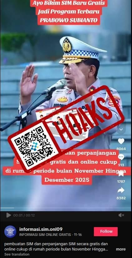 Beredar di media sosial TikTok unggahan video dengan narasi “pembuatan SIM dan perpanjangan SIM secara gratis dan online cukup di rumah periode bulan November Hingga Desember 2025”.