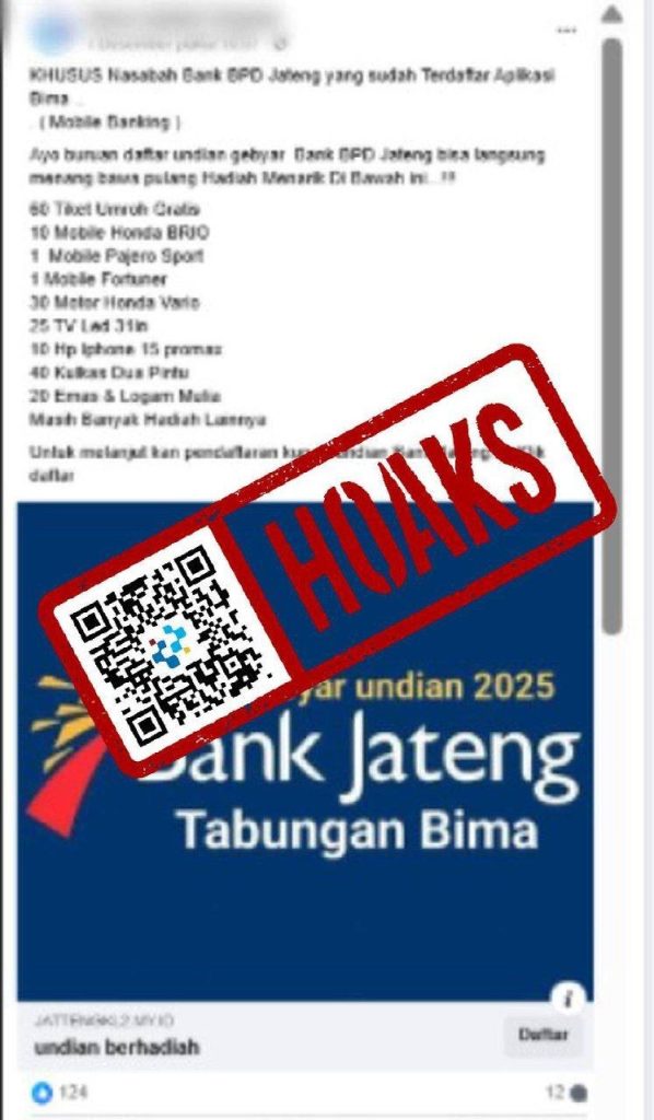 Beredar unggahan di media sosial Facebook berisi narasi dan tautan yang diklaim sebagai akses undian Bank Jateng berhadiah umroh hingga mobil Pajero. Unggahan tersebut beredar pada 1 Desember 2025.