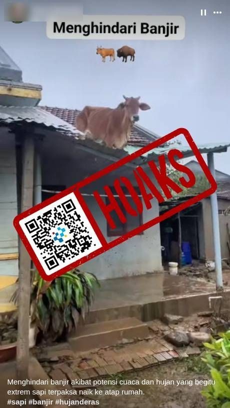 Beredar sebuah unggahan video di media sosial Facebook yang memperlihatkan sapi berada di atap rumah saat terjadi banjir. Video tersebut beredar setelah terjadi bencana yang melanda tiga provinsi di Pulau Sumatra pada akhir November 2025.