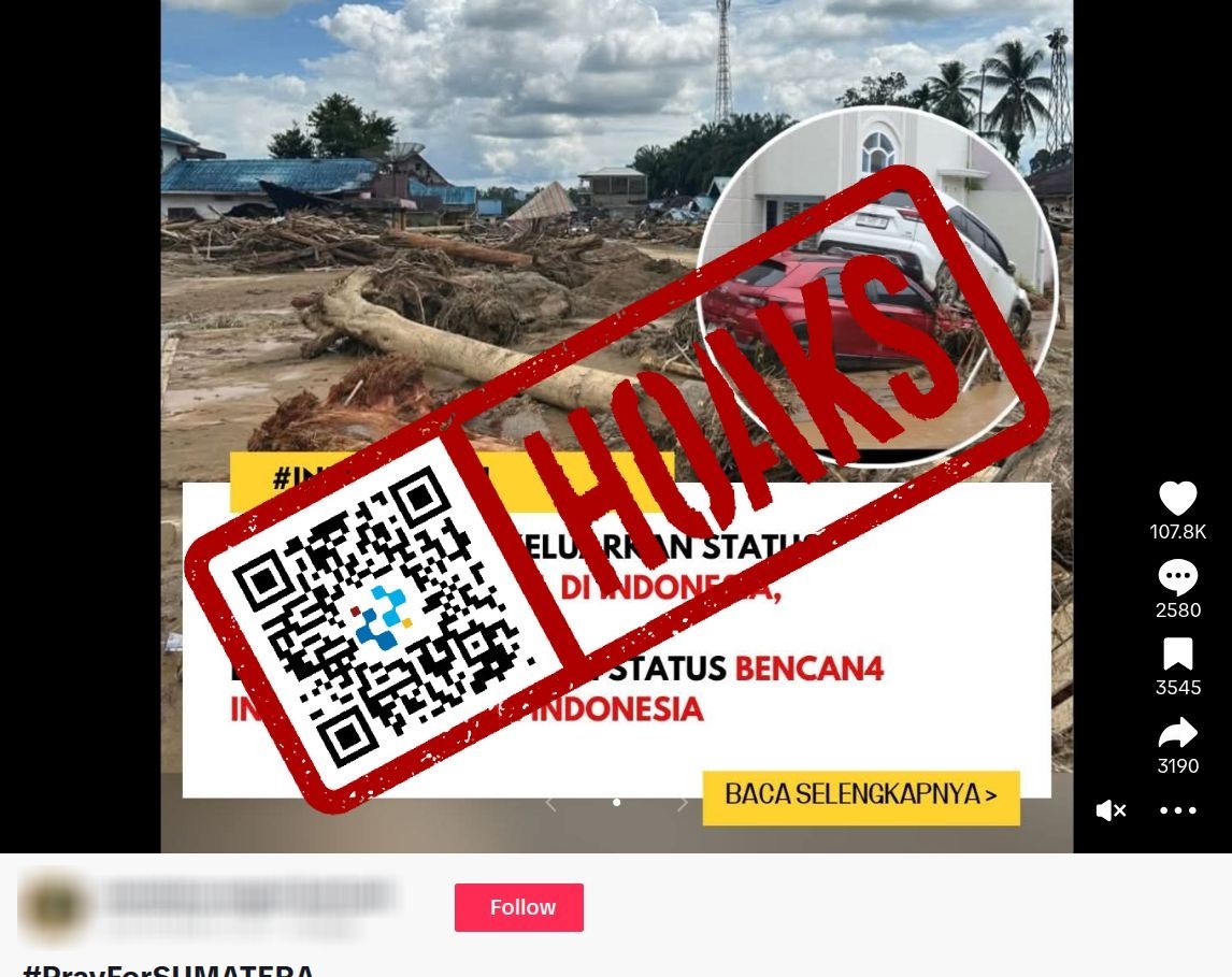 Beredar unggahan di media sosial TikTok yang mengeklaim narasi bahwa peristiwa banjir dan longsor yang terjadi di Pulau Sumatra telah ditetapkan sebagai bencana internasional.