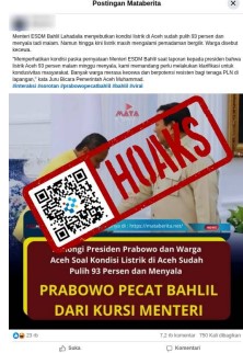 Beredar sebuah unggahan di media sosial yang mengeklaim Presiden Prabowo Subianto memecat Bahlil Lahadalia sebagai Menteri Energi dan Sumber Daya Mineral (ESDM) pada awal Desember 2025. Pemecatan itu dilakukan Presiden Prabowo karena Bahlil membohonginya terkait kondisi listrik di Aceh pasca-banjir dan longsor.