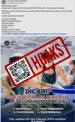 Beredar unggahan sebuah poster lowongan pekerjaan di media sosial Facebook berisi narasi mengenai informasi lowongan 500 pekerja di dapur Makan Bergizi Gratis (MBG). Unggahan tersebut juga disertai tautan untuk mendaftar lowongan tersebut.