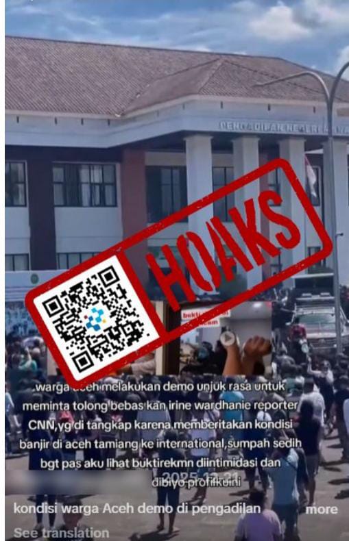 Beredar unggahan di media social TikTok sebuah video menampilkan aksi demonstrasi massa di depan Kantor Pengadilan Negeri Manado. Unggahan tersebut disertai narasi yang mengeklaim warga Aceh melakukan demo menuntut pembebasan reporter CNN Irine Wardhani.