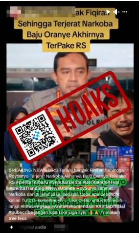 Beredar unggahan di media sosial Facebook tampak polisi sedang memberikan keterangan pers terkait penangkapan seorang berinisial RS yang diklaim sebagai Roy Suryo yang terjerat kasus narkoba.
