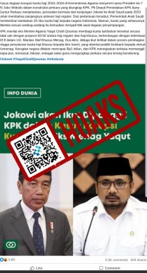 Beredar unggahan foto di media sosial Facebook yang mengeklaim bahwa Komisi Pemberantasan Korupsi (KPK) akan memanggil mantan Presiden ke-7 RI Joko Widodo (Jokowi) dalam Kasus korupsi kuota haji eks Menteri Agama Yaqut Cholil Qoumas.