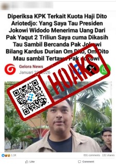 Faktanya, klaim tersebut adalah tidak benar. Dilansir dari turnbackhoax.id, setelah dilakukan penelusuran menggunakan Google Lens dengan memasukan foto artikel yang beredar, hasilnya mengarah ke artikel yang diterbitkan oleh gelora.co berjudul “Diperiksa terkait Kuota Haji, Dito Ariotedjo Ungkit Kunker ke Arab Saudi Bareng Jokowi”. Artikel yang tayang Jumat, 23 Januari 2026 itu melaporkan bahwa mantan Menteri Pemuda dan Olahraga (Menpora) Dito Ariotedjo memenuhi panggilan KPK pada Jumat, 23 Januari 2026. Dito diperiksa sebagai saksi kasus dugaan korupsi kuota haji 2024. Saat ditanya mengenai pengetahuannya terkait perkara tersebut, ia menyinggung kunjungan kerja ke Arab Saudi bersama Jokowi yang merupakan presiden saat itu. Dengan demikian, klaim bahwa Dito Ariotedjo menyebut Jokowi menerima Rp2 triliun dari Yaqut Cholil merupakan pernyataan tidak berdasar.