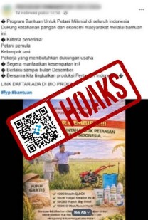 Beredar sebuah unggahan di media sosial Facebook yang mengeklaim adanya tautan pendaftaran bantuan alat pertanian untuk petani milenial dari Kementerian Pertanian (Kementan). Informasi tersebut diunggah pada 12 Februari 2026.