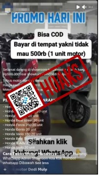 Beredar di media sosial Facebook unggahan berupa video yang mengeklaim Gubernur Jawa Barat Dedi Mulyadi mengadakan program tebus motor murah seharga Rp500.000. Untuk mendapat motor seharga Rp500.000, masyarakat diminta menghubungi nomor WhatsApp yang tertera dalam unggahan. Motor murah itu diklaim hanya tersedia 10 unit.