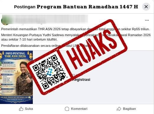 Beredar sebuah unggahan di media sosial Facebook berisi tautan yang diklaim merupakan tautan pendaftaran THR ASN 2026 dari pemerintah bagi para Aparatur Sipil Negara (ASN) 2026 yang dibayarkan dengan total anggaran sekitar Rp55 triliun.